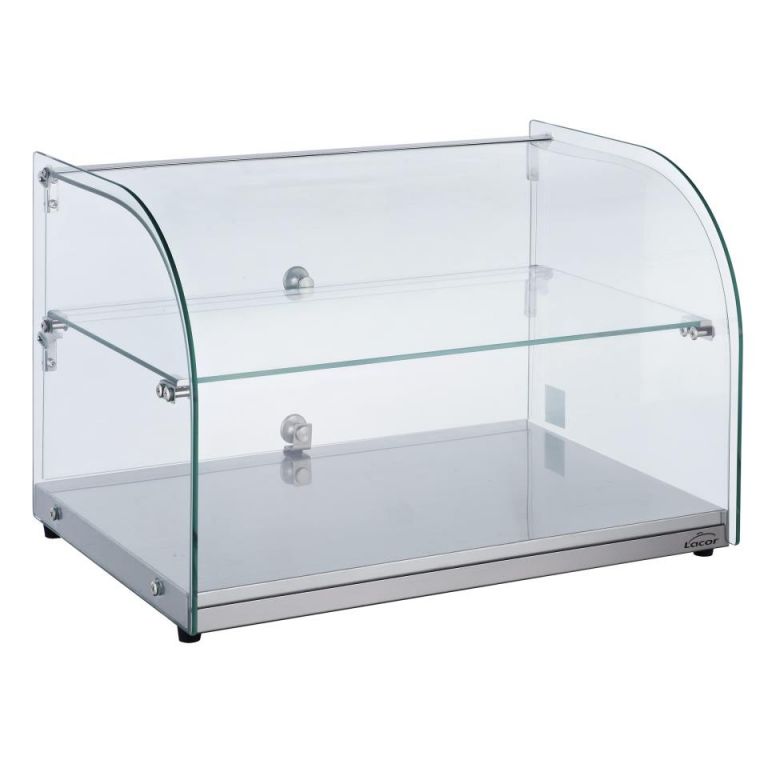 Vitrina neutra construida íntegramente en cristal y base de acero inoxidable. Está diseñada para presentar y exponer sobre la barra/mostrador.Superficie superior curvada para una visión panorámica y estante intermedio de cristal templado.Puerta trasera abatible y 4 pies de goma que garantizan máxima estabilidad.Medidas de estante de abajo: 53,5 x 36 cm y estante de arriba: 53,5 x 30 cm.La dimensión de la vitrina total es de 55,4 x 37,6 x 37 cm y con una capacidad de 45 L.